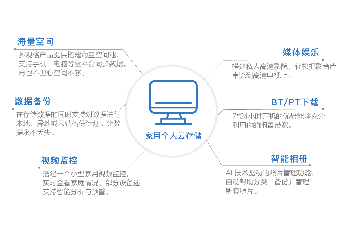 個(gè)人、家庭、小型工作室對(duì)于文件存儲(chǔ)、視頻監(jiān)控、多媒體串流電視、智能相冊(cè)的強(qiáng)烈需求