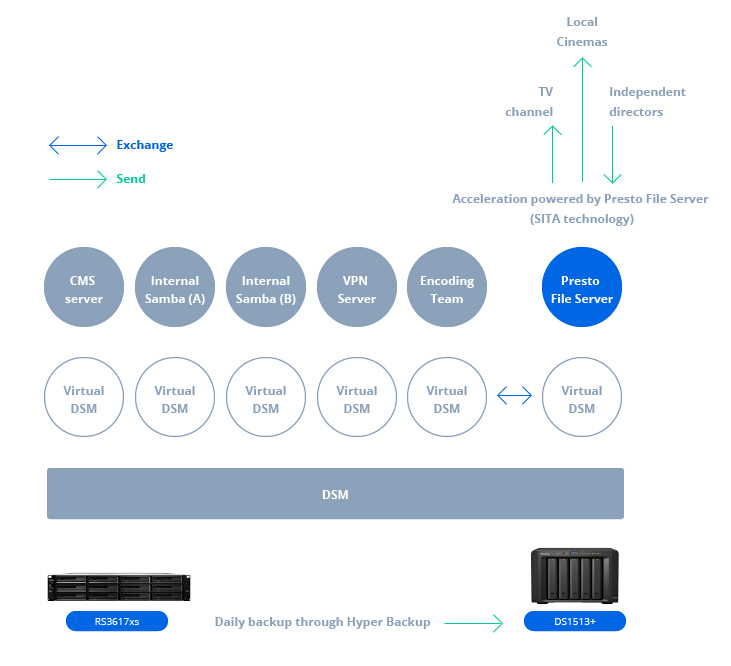 This time, it purchased the RS3617xs, which consisted of 12 10TB HDDs, and then built six fully isolated virtual instances of the Virtual DSM running on the device for the different purposes required, each with its own VLANs to meet MPAA (American Film Institute) security regulations for different network accessibility of different devices.
