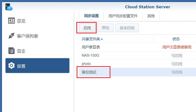2, in the Cloud Station Server, set, enable the new "backup test" shared folder;