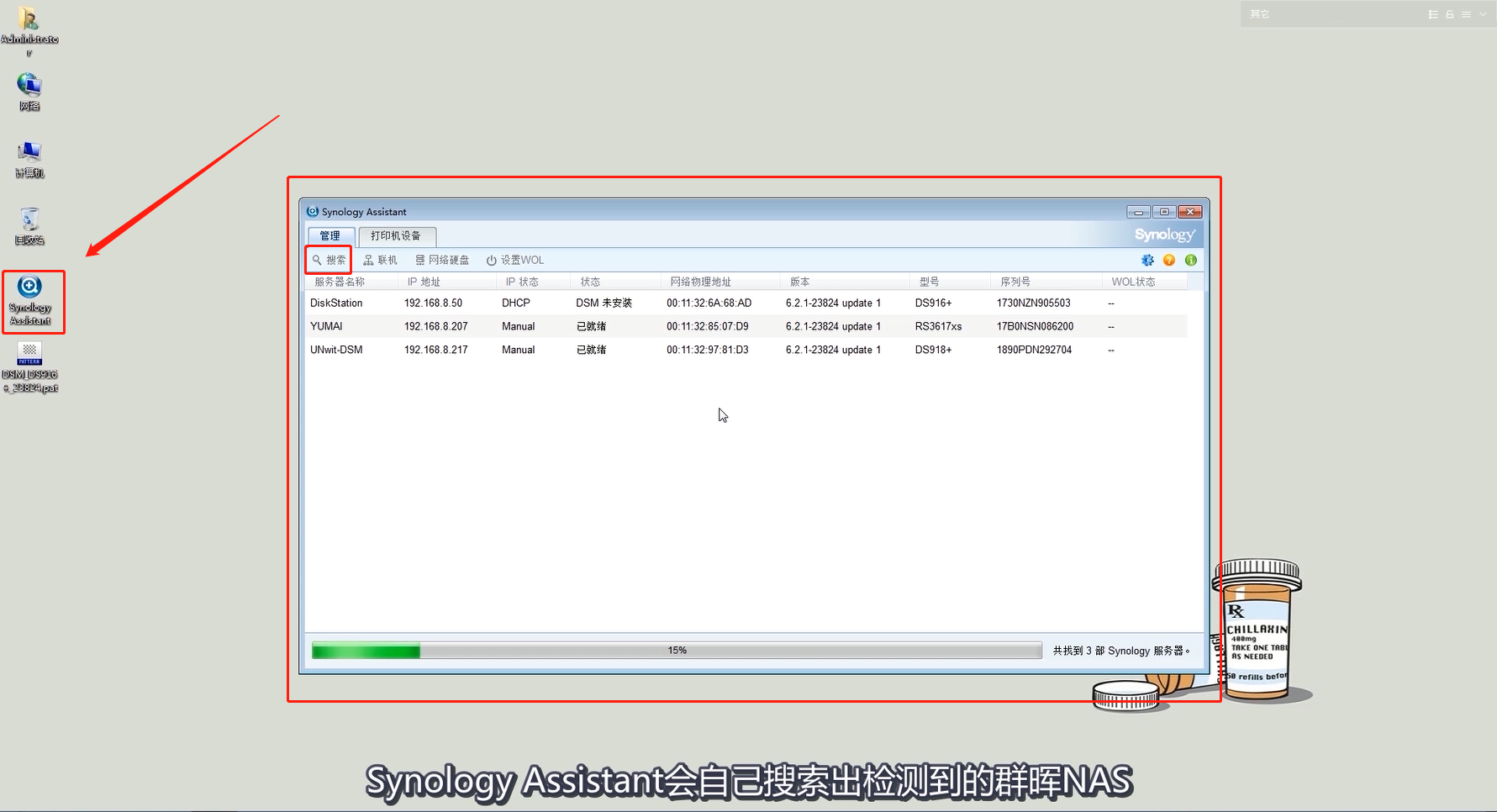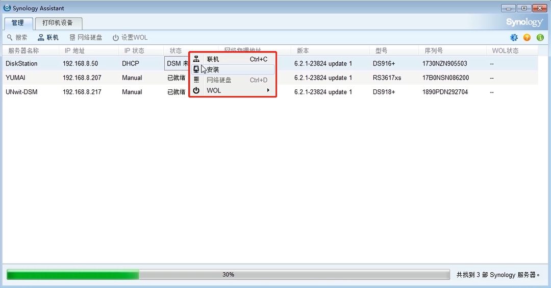 First install the new software, install Synology Assistant, and then open the Synology Assistant software to scan the Synology NAS network storage device in the same network.