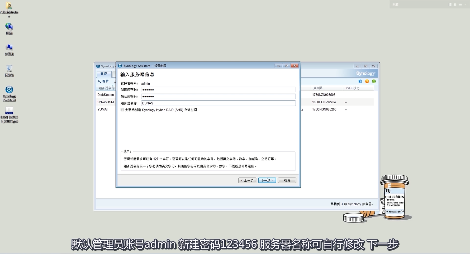 Next, enter the administrator's password, you can modify the server name according to your needs, you can also modify it in the system without changing it. Don't check the installation to create Synology Hybrid RAID (SHR) storage space, which is too time consuming. Some users need RAID 5 or other arrays.