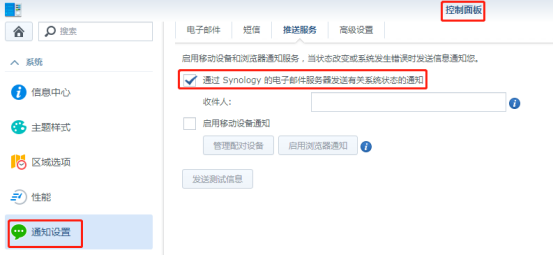 Note: Service providers have Gmail, Yahoo! , Outlook, QQ or custom SMTP server or register the synology account in the information center to receive system alarm information.