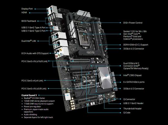 其他配置方面,ATX標(biāo)準(zhǔn)板型,10相供電,24針主供電接口和8+8+6針輔助供電接口,但散熱片并不算很夸張。四條DDR4內(nèi)存插槽,最高頻率4266MHz,最大容量64GB。六個SATA 6Gbps,兩個M.2-22110 32Gbps(均覆蓋散熱片)、兩個U.2 32Gbps。