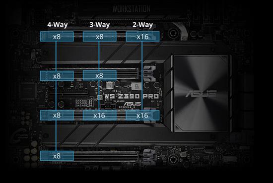華碩這塊板子配備了四條PCI-E 3.0 x16插槽,并搭載一顆PCI-E 3.0 x48橋接芯片,可支持單路x16、雙路x16/x16(第一條和第三條)、三路x8/x8/x16、四路x8/x8/x8/x8,另外還有一條芯片組支持的PCI-E x4插槽。