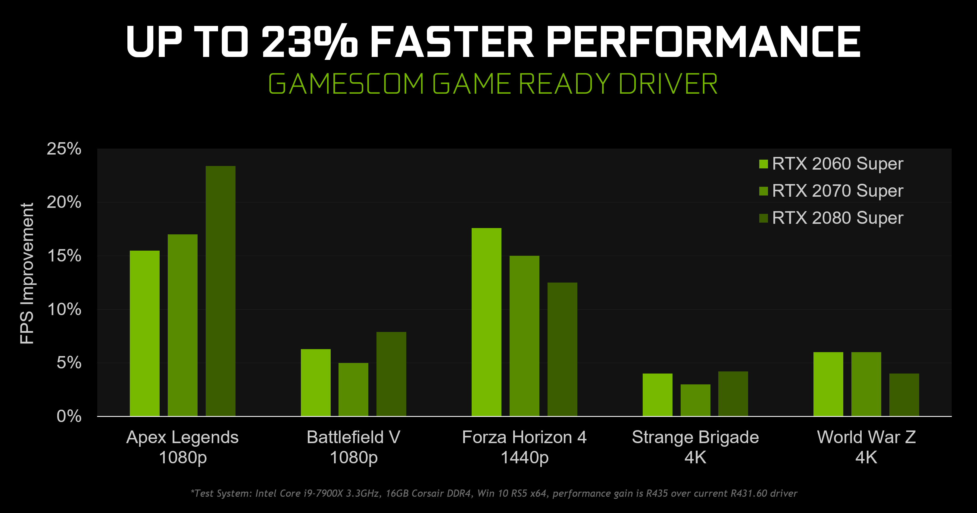 GeForce 436.02新驅(qū)動下,《Apex英雄》、《戰(zhàn)地5》、《極限競速:地平線4》、《奇異小隊》、《僵尸世界大戰(zhàn)》等游戲的性能,相比于此前的431.60版本,可提升最多達23.4%。
