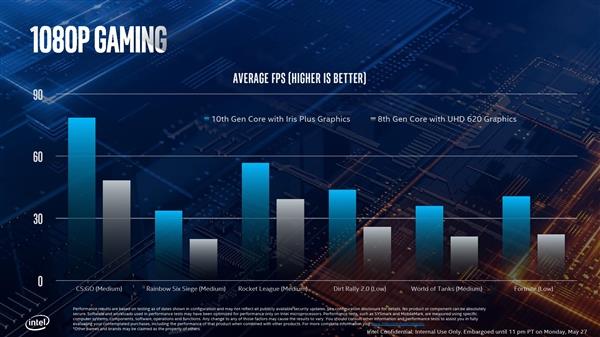 EU單元規(guī)模及先進(jìn)技術(shù)的加入,使得Gen11核顯的游戲性能比前代翻倍,48/64單元的Iris Plus核顯可以保證多數(shù)游戲大作的平均幀率超過30FPS,部分還能突破60FPS,完全可以保證大部分游戲中的流暢體驗(yàn)。