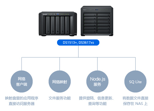 由此,網(wǎng)格化管理不僅需要一套操作簡便、兼容性廣泛的應用系統(tǒng),同時服務器還要能夠承受文件頻繁創(chuàng)建、修改,并且還需要應對可能出現(xiàn)的服務器高流量,借助平臺實現(xiàn)高可用,并且與本地的內(nèi)網(wǎng)系統(tǒng)實現(xiàn)集成?;谝陨蠎眯枨?,群暉制定了 NAS 文件服務 + Node.js 數(shù)據(jù)庫服務( sqlite+socket )+ 綠色客戶端軟件的方案,架構圖如下: